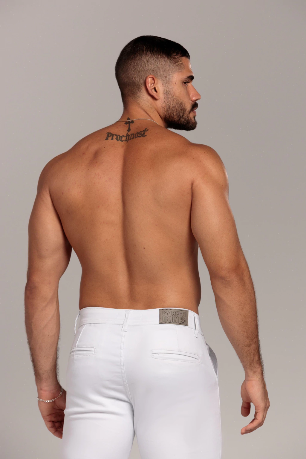 A calça de alfaiataria masculina branca, confeccionada em tecido lito, é a escolha perfeita para quem busca sofisticação e versatilidade. Seu corte ajustado valoriza a silhueta, garantindo um caimento impecável e conforto para diversas ocasiões. Ideal para combinações formais com camisas e blazers ou para um look casual chic com camisetas e mocassins. Adicione um toque de elegância ao seu guarda-roupa com essa peça indispensável.